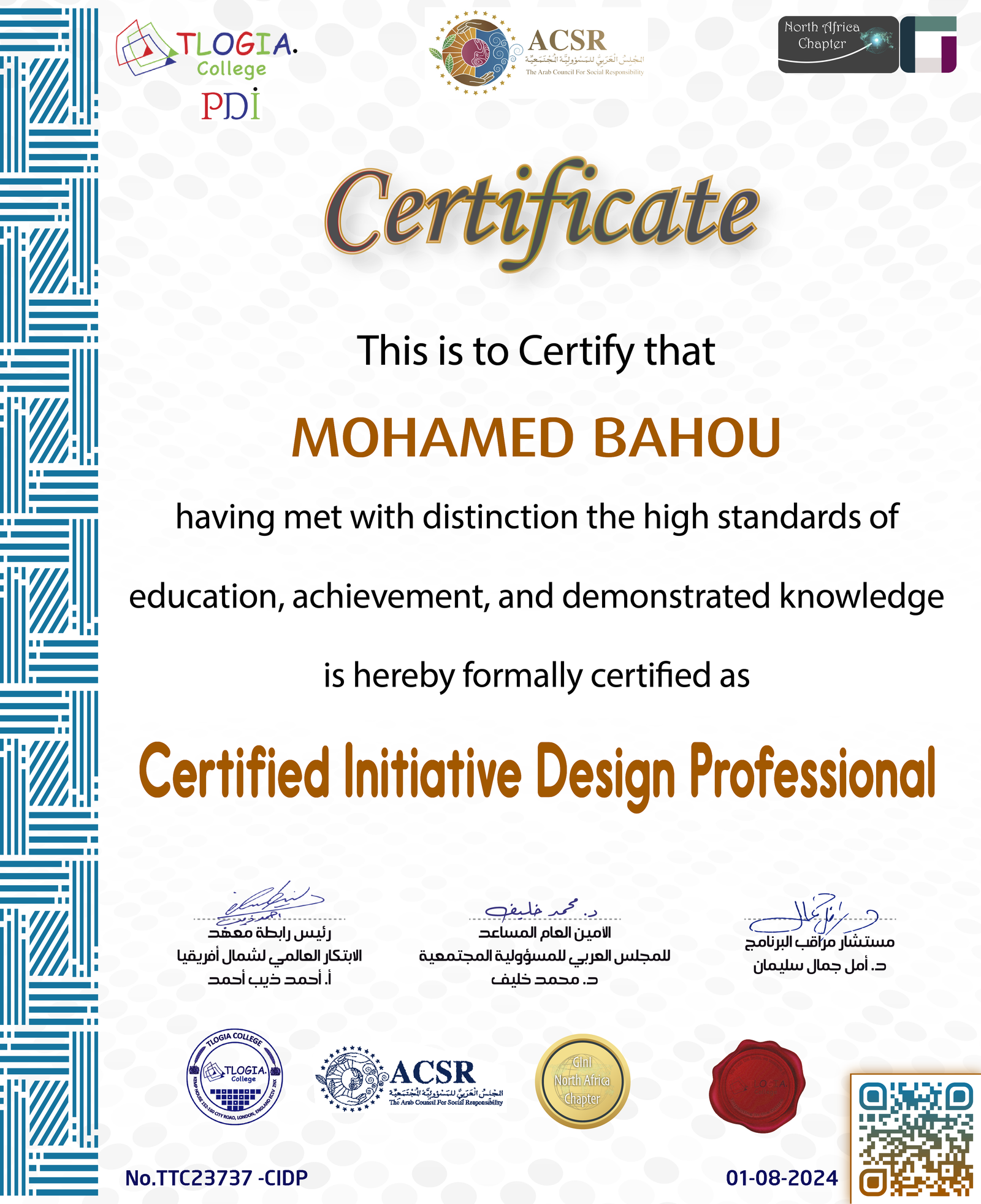 CIDP – MOHAMED BAHOU CIDP – MOHAMED BAHOU33 Downloads Certified Initiative Design Professional محترف معتمد في تصميم المبادرات Download Now! Ahmad Mahallawy2024-08-03T19:29:50+03:00