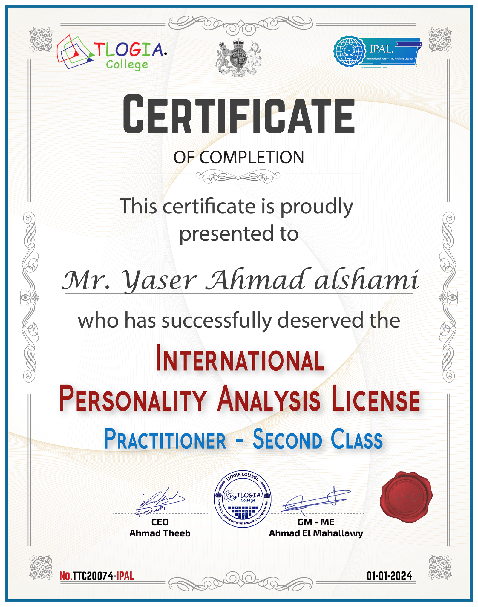 شهادة الرخصة الدولية لتحليل الشخصيات – ياسر أحمد الشامي